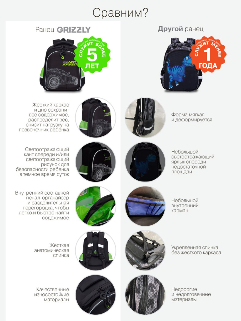 Дешевые рюкзаки часто рвутся к середине учебного года, а их фурнитура ломается. GRIZZLY рассчитан на 5–7 лет благодаря: